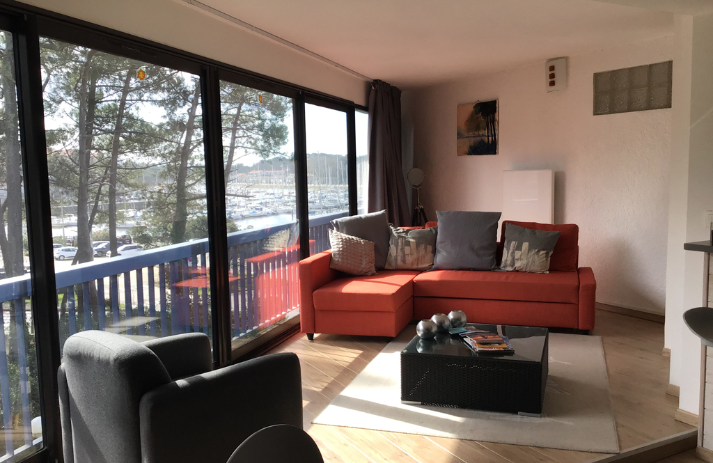 Große Fensterfront von 7 Metern im Wohnzimmer, die einen sehr angenehmen Blick auf die schönen Bäume und den Jachthafen von Capbreton bietet. Sehr gut ausgestattete amerikanische Küche.